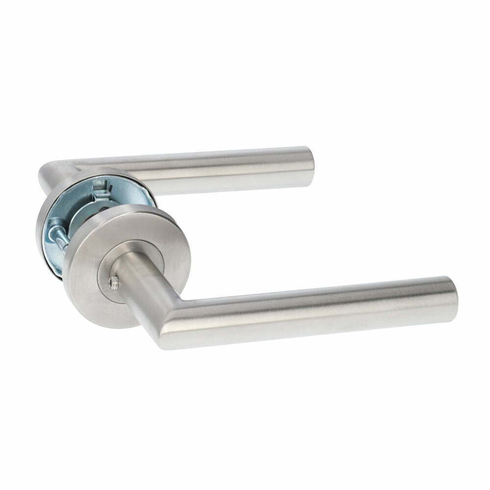 Artitec RVS rozet-krukgarnituur voor binnendeuren. Vastdraaibaar deurkrukgarnituur met veer op stalen onderconstructie.