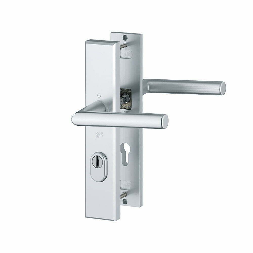 - HOPPE aluminium inbraakwerend langschild-krukgarnituur met cilinder-trekbeveiliging voor buitendeuren.