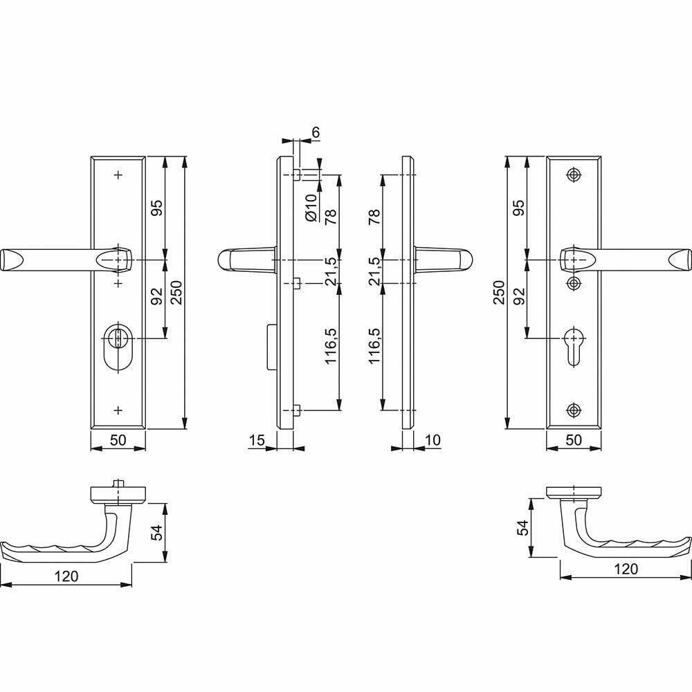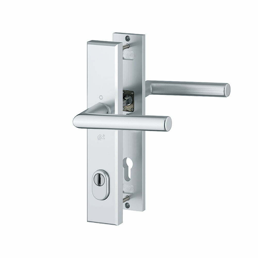 - HOPPE aluminium inbraakwerend langschild-krukgarnituur met cilinder-trekbeveiliging voor buitendeuren.
