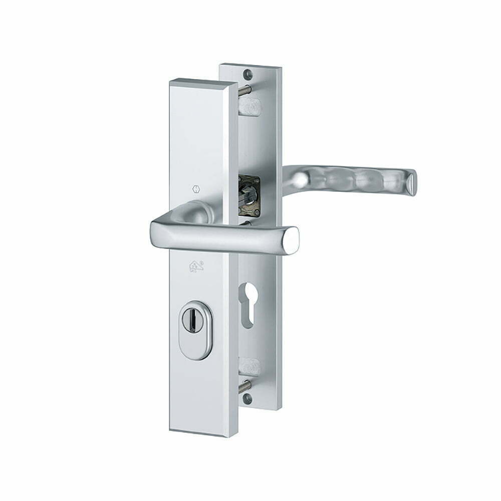 HOPPE aluminium inbraakwerend langschild-krukgarnituur met cilinder-trekbeveiliging voor buitendeuren. Voldoet aan Politie Keurmerk Veilig Wonen en SKG***. Voor zowel links- als rechtsdraaiende deuren. PC maat 72 mm. Geschikt voor een deurdikte van 53-58 mm.