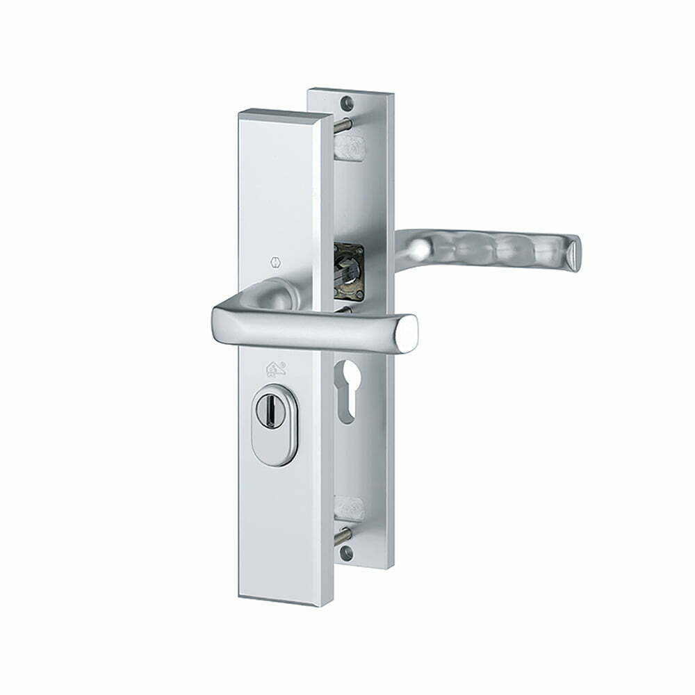 - HOPPE aluminium inbraakwerend langschild-krukgarnituur met cilinder-trekbeveiliging voor buitendeuren.