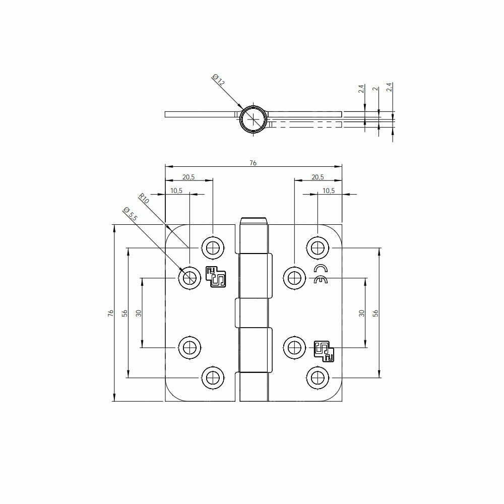 - Ongelagerd, lichtlopend, stalen S2 scharnier met rechte hoeken.